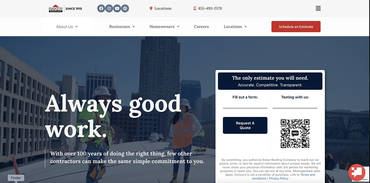 Baker Roofing Company is a strong example of how clear structure and user-friendly navigation can drive conversions for a large, multi-service contractor.