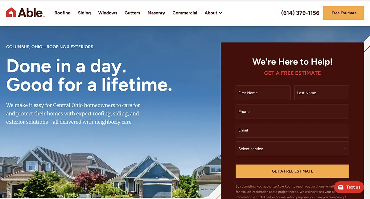 Able Roofing’s website does an excellent job balancing service depth with simplicity.